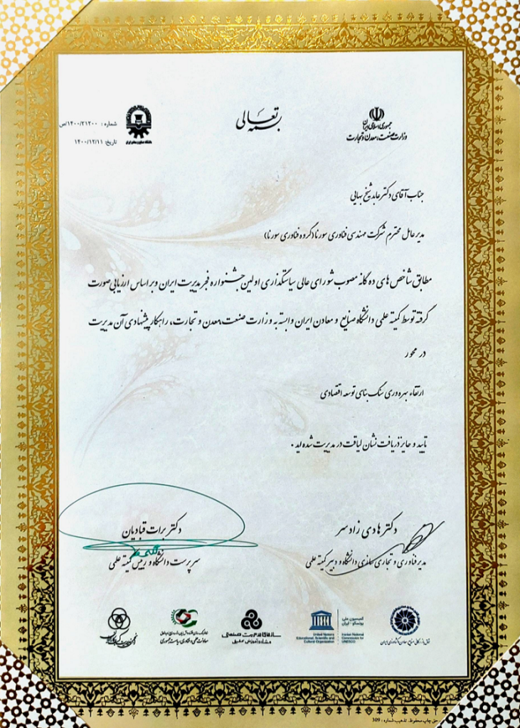 شایا ذکر است راهکار پیشنهادی آقای عابد شیخ بهایی ، مدیر عامل شرکت مهندسی فناوری سورنا و رییس انجمن شرکت های دانش بنیان استان کرمان طبق شاخص های ده گانه مصوب شورای سیاستگذاری اولین “جشنواره ملی فجر مدیریت ایران” بر اساس ارزیابی صورت گرفته توسط کمیته علمی جشنواره ( وابسته به وزارت صمت) ، تایید و حائز دریافت نشان لیاقت گردید .